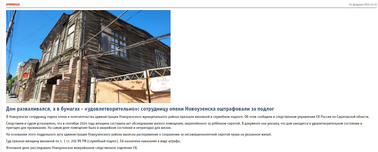 Совершение служебного подлога (ч. 1 ст. 292 УК РФ) может привести к нарушению прав сирот и детей, оставшихся без попечения родителей, выражающееся в непостановке на учёт на получение жилья из-за отсутствия признания жилья непригодным для проживания согласно п. 1 ст. 8 Федерального закона "О дополнительных гарантиях по социальной поддержке детей-сирот и детей, оставшихся без попечения родителей" от 21.12.1996 N 159-ФЗ.