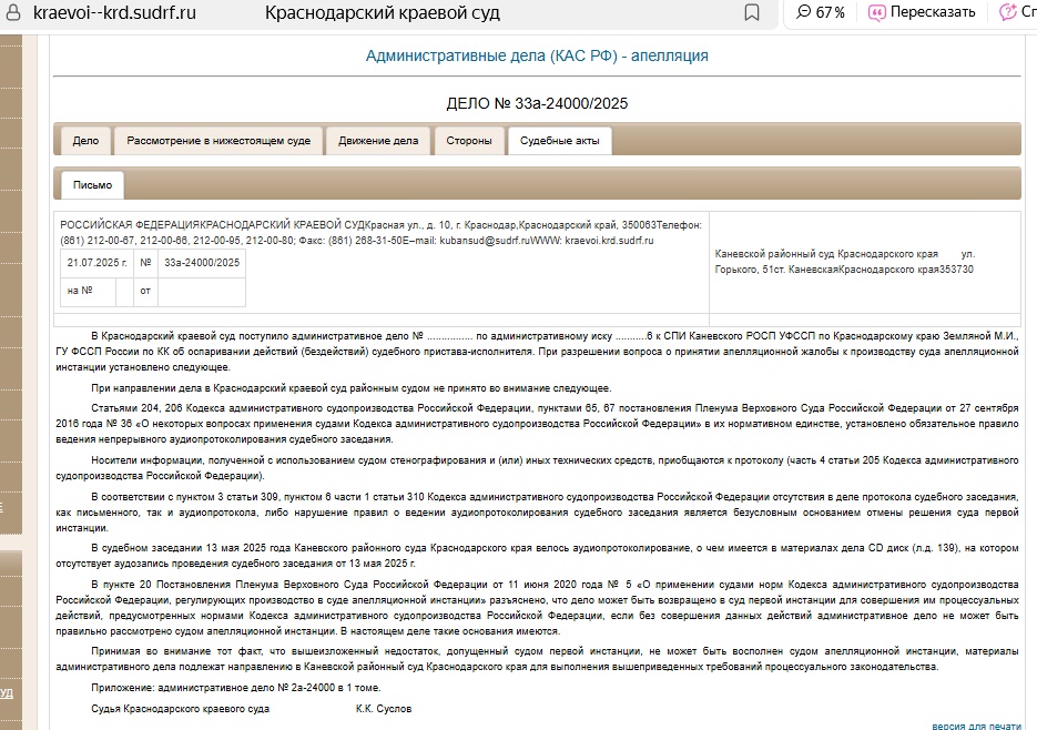 И ещё удивительный момент в этом деле: вместо отмены решения судьи- председателя Каневского районного суда судья Краснодарского краевого суда Суслов К.К. снял с рассмотрения дело, но не отменил решение в июле 2025.