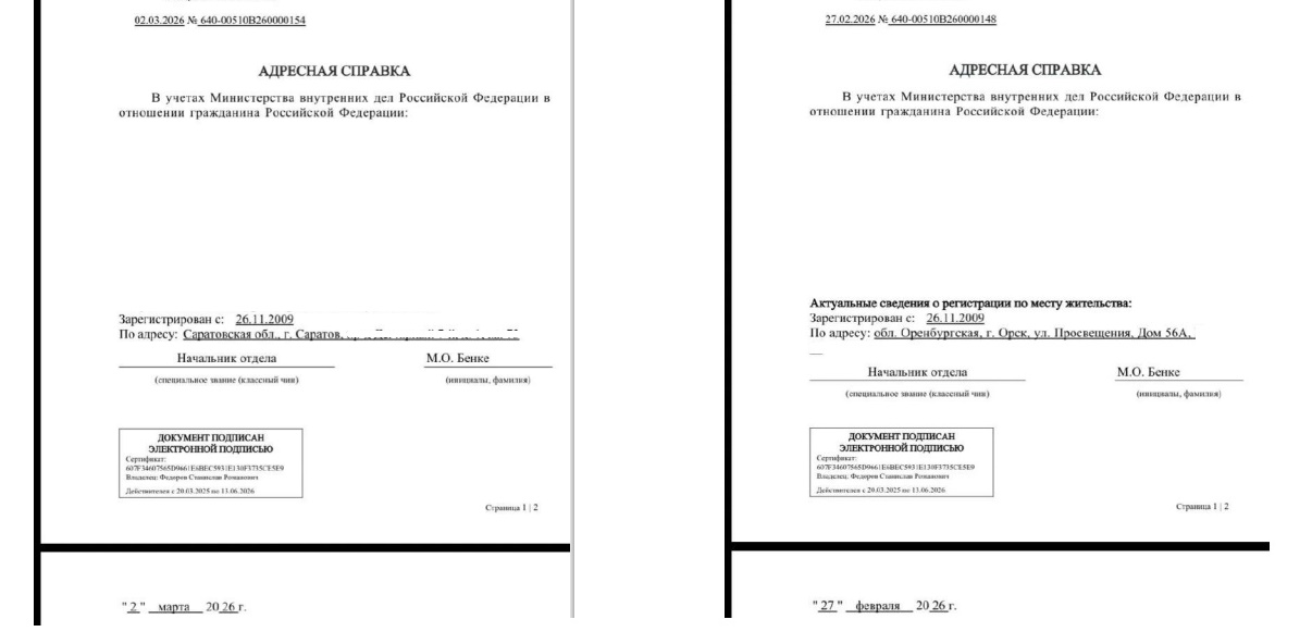 Заказываем справку в Госуслугах- по первой вкладке приходит одна информация, а по другой другая(предыдущие прописки) в отношении моего сына, 2 разных города, 2 разных адреса, одинаковы только даты регистрации.